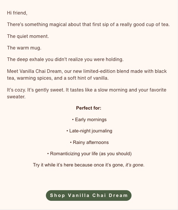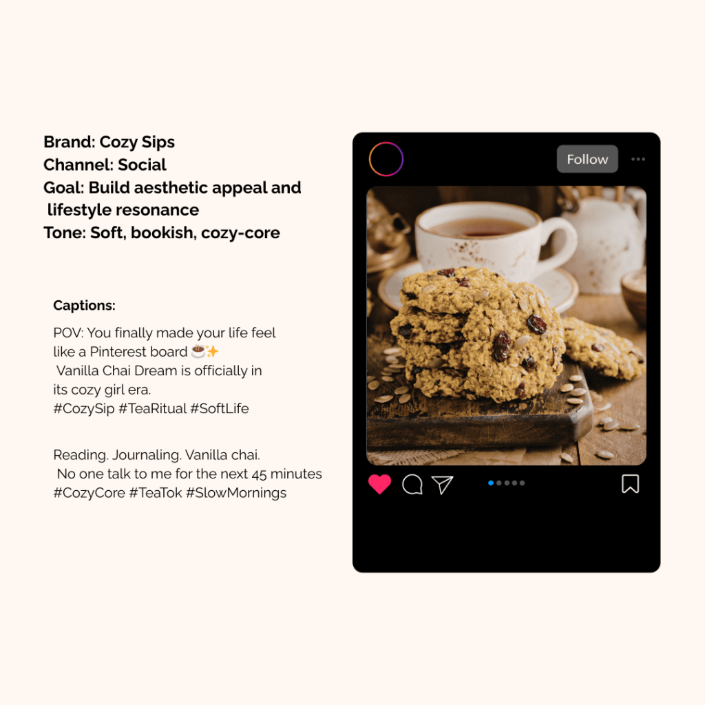 Across these spec projects, I focused on adapting one core message across six channels per brand while maintaining tone consistency, clarity, and conversion focus. Each brand voice was designed to feel distinct; from cozy lifestyle (Cozy Sip) to bright modern skincare (Sunkissed) while applying the same strategic principles: benefit-driven messaging, friction-reducing microcopy, cultural awareness, and UX-informed clarity. My goal was to create copy that feels human, on-brand, and effective at every touchpoint.