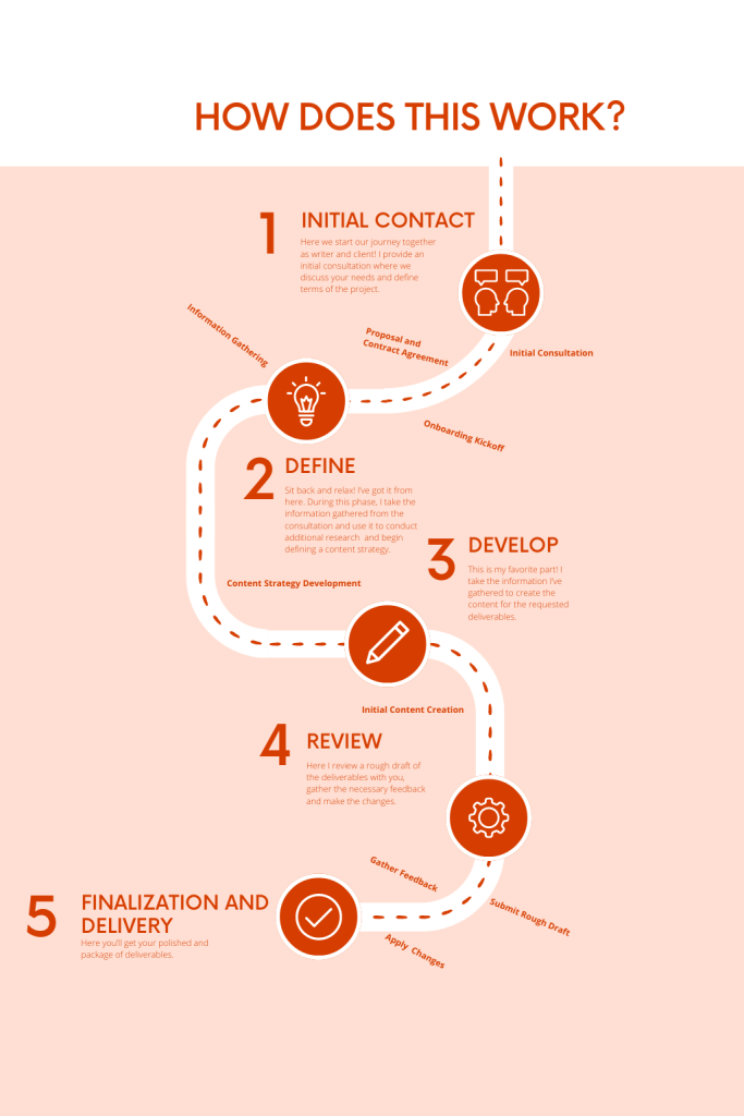 My writing process involves thorough research, understanding your needs and audience, creating an outline, drafting the content, and revising based on your feedback. I ensure each piece is polished and ready for publication before submission. If you want a better idea of the process as a whole, check out the infographic below: